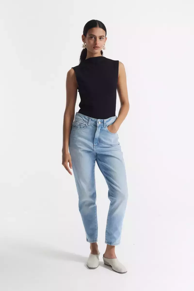 Jean mom celeste clásico, tiro alto. Esta localizado y tiene bigotes. Confeccionado en denim rígido, algodón 100%